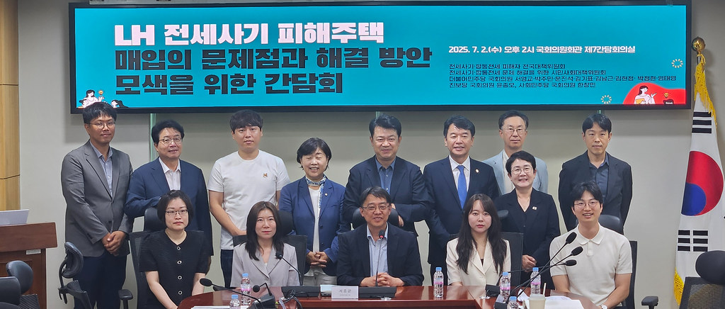 오늘(7/2) 오후 2시, 전세사기·깡통전세 피해자 전국대책위원회, 전세사기·깡통전세 문제 해결을 위한 시민사회대책위원회, 더불어민주당 서영교·박주민·문진석·김기표·김남근·김현정·박정현·염태영 의원, 진보당 윤종오 의원, 사회민주당 한창민 의원은 국회의원회관 제7간담회의실에서 <LH 전세사기 피해주택 매입의 문제점과 해결 방안 모색을 위한 간담회>를 개최했습니다. 이번 간담회는 서종균 전 주택관리공단 사장의 사회로 진행되었으며, ▲신탁사기 피해, ▲경매차익 적은 피해 사례 및 외국인 피해자, ▲경매업자·채권자의 우선매수권 행사 방해 등 사례 발표와 LH 매입 방안의 문제점과 개선방안을 주제로 한 발제, 토론이 이어졌습니다.