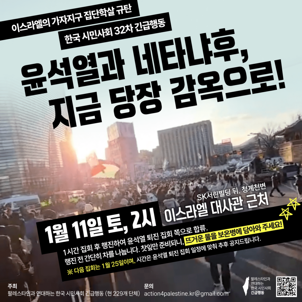 229개 한국 시민사회단체가 함께하고 있는 <팔레스타인과 연대하는 한국 시민사회 긴급행동>은 1월 11일(토) 14시, 청계천 SK서린빌딩 뒤편에서 <이스라엘의 가자지구 집단학살 규탄 한국 시민사회 32차 긴급행동>을 개최하였습니다. 이날 집회에서는 각계 발언과 연대 공연 등이 진행되고 재한 팔레스타인인을 비롯한 많은 국내외 시민들이 참석하였습니다.