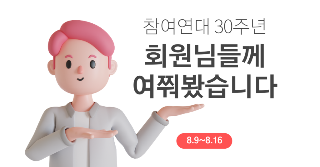 참여연대는 내년 30주년을 맞이합니다. 참여연대가 걸어온 지난 시간들은 더 많은 민주주의와 인권, 평화를 향한 여정이었습니다. 전진과 후진을 반복하는 더딘 걸음 속에서도 참여연대가 끈질기게 활동해올 수 있었던 데에는 회원들의 힘이 무엇보다 중요했습니다. 참여연대는 지난 활동들을 돌아보며 더 나은 방향과 역할을 고민하고 있습니다. 이번 설문은 그 고민을 담아 1만 4천여명의 회원들의 의견을 직접 듣기 위해 마련했습니다. 많은 질문에도 불구하고 애정을 담아 설문에 참여해주신 회원들께 거듭 감사드립니다.