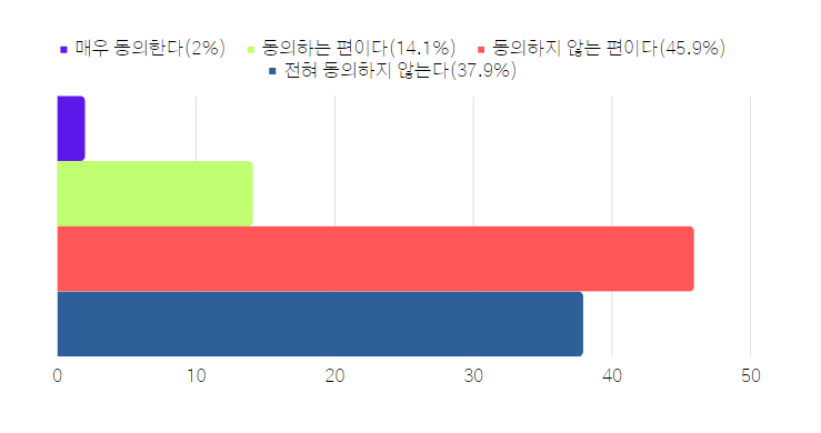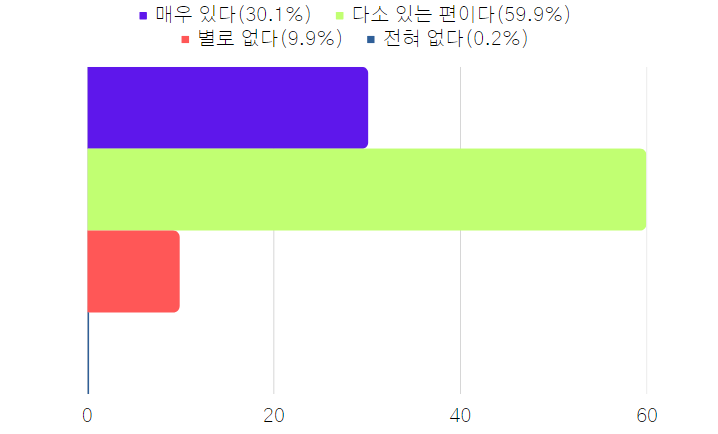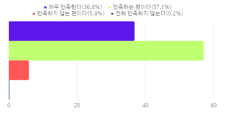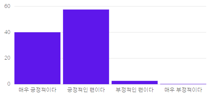 - 매우 긍정적이다(39.9%), 긍정적인 편이다(57.4%), 부정적인 편이다(2.5%), 매우 부정적이다(02.%)로 나타났습니다.