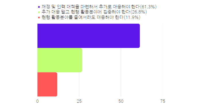 - 재정 및 인력대책을 마련해서라도 새로운 대응과 현행 사업을 지속해야한다는 의견(61.3%)이 가장 많았습니다.