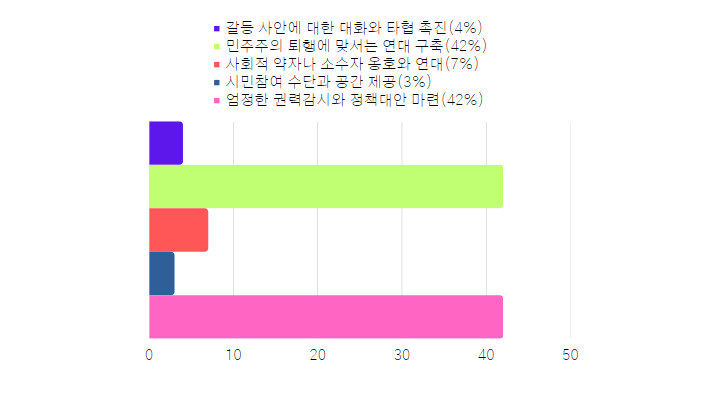 - 현 정부하 참여연대 역할로 엄정한 권력감시와 정책대안 마련(42%), 민주주의 퇴행에 맞서는 연대구축(42%)이 가장 높은 응답을 기록했습니다.