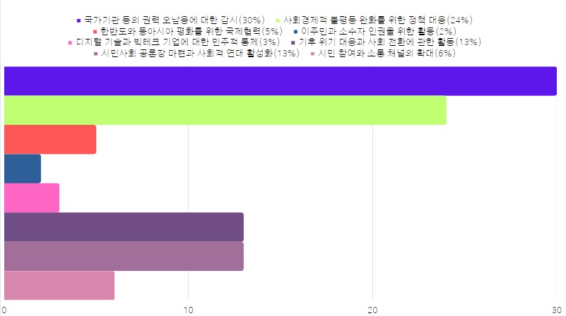 - 향후 10년, 참여연대가 강화해야할 활동은 국가기관 등의 권력오남용 감시(30%), 사회경제적 불평등 완화를 위한 정책 대응(24%), 기후위기 대응과 사회전환에 관한 활동(13%), 시민사회 공론장 마련과 사회적 연대 활성화(13%) 순으로 나타났습니다.