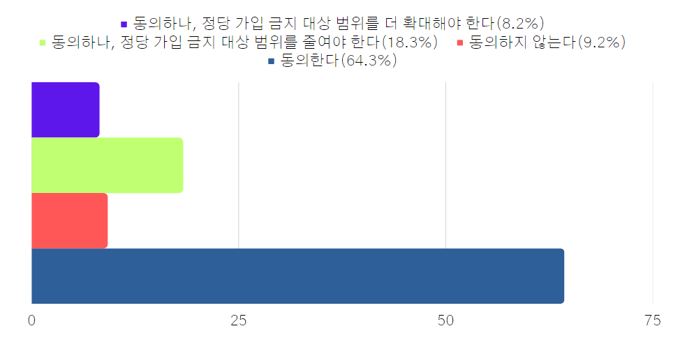 - 주요임원의 정당가입 금지에 대해 동의(64.3%), 동의하나, 정당가입 금지 대상 범위를 줄여야 한다(18.3%) 순으로 나타났습니다.
