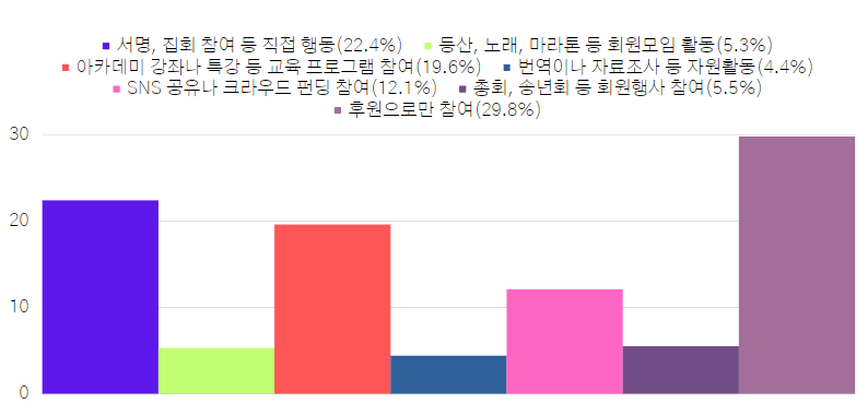 - 참여할 의향이 있는 활동은 후원(29.8%), 서명, 집회참여 등 직접행동(22.4%), 아카데미 강좌나 특강 등 교육프로그램(19.6%) 순으로 나타났습니다.