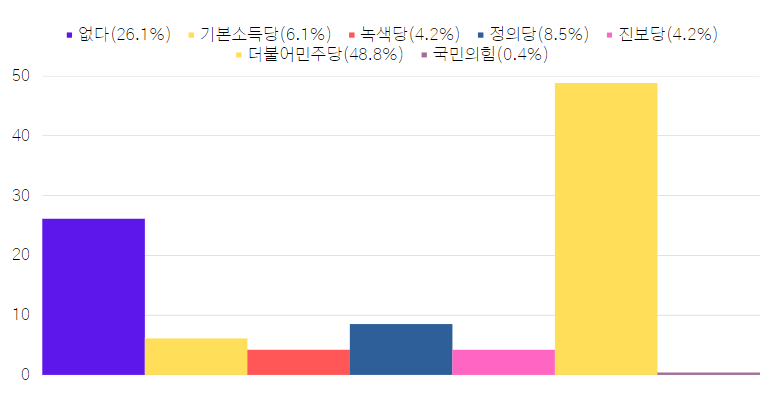 - 회원들이 지지하는 정당은 더불어민주당(48.8%), 무당(26.1%), 정의당(8.5%) 순으로 나타났습니다.