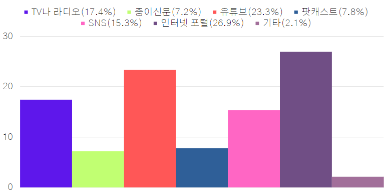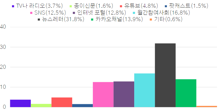 - 회원들은 평소 여러 소식을 인터넷 포털(26.9%), 유튜브(23.3%), TV나 라디오(17.4%) 등을 통해 접하는 것으로 나타났습니다.