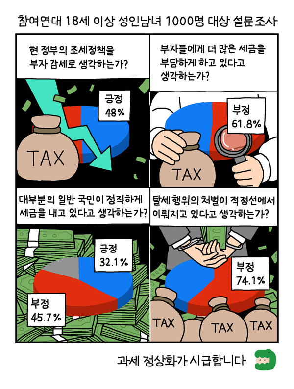 이에 참여연대 조세재정개혁센터는 3월 3일 제58회 납세자의 날을 맞아 현 정부의 조세·재정 정책에 대한 국민여론조사를 특집으로 진행하고, 이후 매월 정기적인 조사를 통해 시민들의 의견을 확인하고자 합니다.