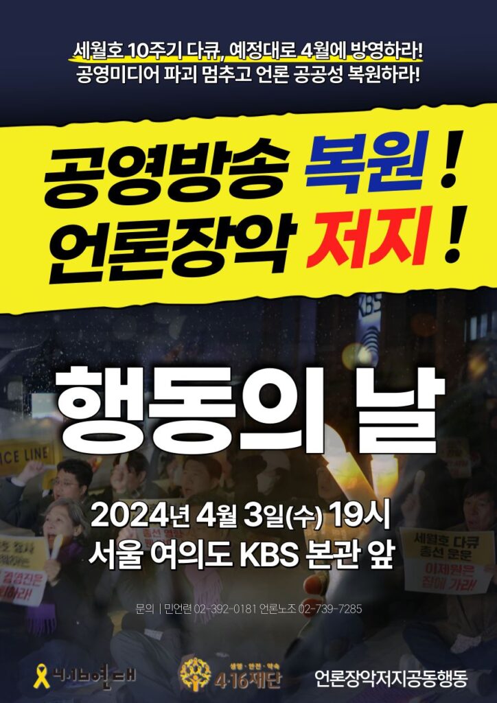 그런데 KBS사측은 4월 18일(목)에 방영할 예정이었던 세월호 10주기 다큐를 ‘4월 10일 총선에 영향을 준다’는 이유로 불방 결정을 내렸습니다. 납득할 수 없는 부당한 변명에 분노한 시민들은 지난 2월 21일부터 4주째 매주 수요일 자발적으로 KBS 앞에 모여 촛불을 들어 왔습니다.