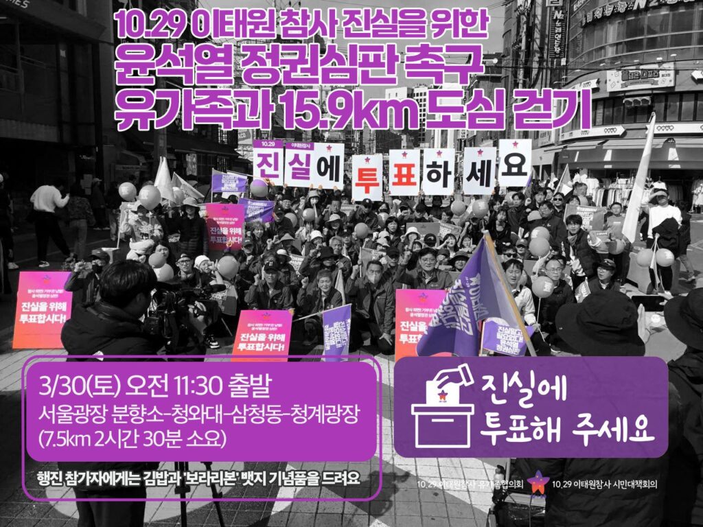 10.29 이태원 참사가 발생한지 500일이 지났지만 윤석열 정권은 끝내 특별법을 거부하고 유가족을 외면하였습니다. 고통스러운 시간을 보내고 계신 유가족들과 함께 도심을 걸으며 참사를 기억하고 진실을 위해 윤석열 정권 심판을 촉구하는 15.9km 서울도심 걷기에 함께 하세요.🙏