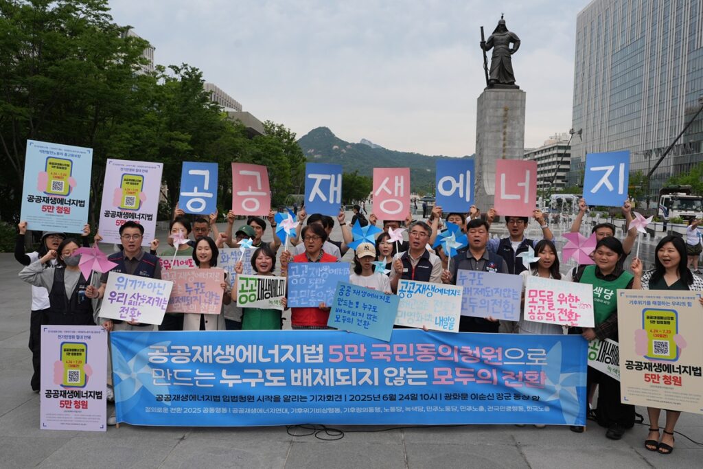 2025년 6월 24일, 공공재생에너지 확대와 정의로운 전환을 통한 발전노동자 총고용 보장 2025 공동행동(약칭, 정의로운전환 2025 공동행동)이 <공공재생에너지법> 5만 국민동의청원의 시작을 알리는 기자회견을 개최했다. 이들은 기후위기의 긴급한 대처, 전력민영화에 대한 우려, 석탄발전소 폐쇄에 따른 발전노동자의 고용 위협 등에 대응할 수 있는 <공공재생에너지법> 제정을 요구했다. 정의로운전환 2025 공동행동은 6월 23일(월) 국회에 국민동의청원을 신청하고 이를 시작하는데 필요한 요건인 100명의 찬성을 확보한 상태이며, 국회의 검토가 끝나는대로 공식적인 입법청원이 시작된다. 앞으로 한 달간 5만 명의 동의를 얻어, <공공재생에너지법>의 입법청원을 성사시킬 계획이다.