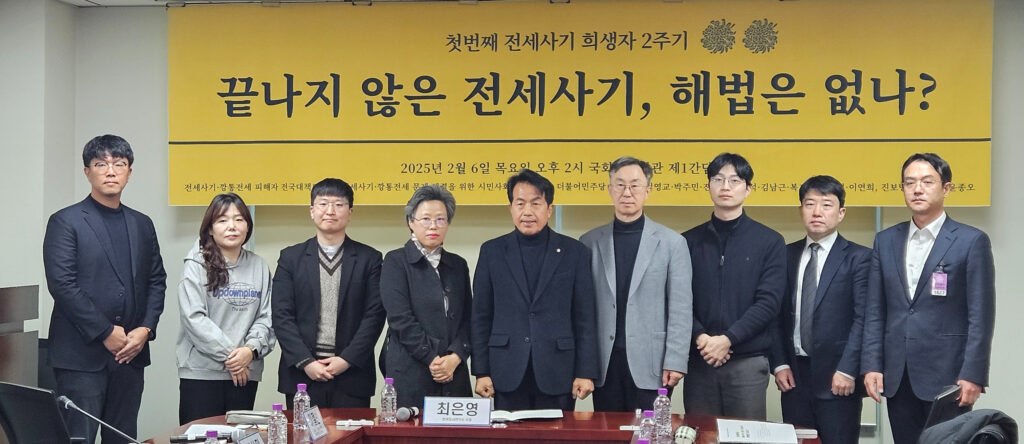 오늘(2/6) 전세사기·깡통전세 피해자 전국대책위원회, 전세사기·깡통전세 문제 해결을 위한 시민사회대책위원회, 더불어민주당 서영교·박주민·진성준·문진석·김남근·염태영·복기왕·이연희 의원, 진보당 윤종오 의원은 오후 2시, 국회의원회관 제1간담회의실에서 전세사기 첫번째 희생자 2주기를 즈음하여 현 상황을 진단하고, 전세 문제 해결을 위한 개혁 과제를 도출하는 토론회를 개최했습니다.