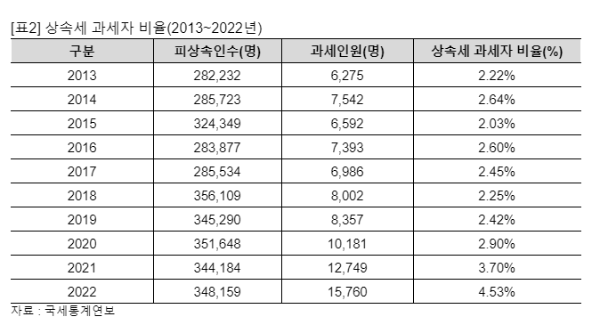 상속세는 100명 중 겨우 4.5명만 내는 세금이며, 상속 재산 가액이 100억이 넘는 부자들이 대부분을 납부하고 있습니다. 2013년부터 2022년까지 전체 상속인 중 상속세를 납부한 건수는 평균 2.6%에 불과했고, 전체 상속세의 85.4%를 상속 규모가 100억 이상인 상속자 338명이 납부하였습니다.