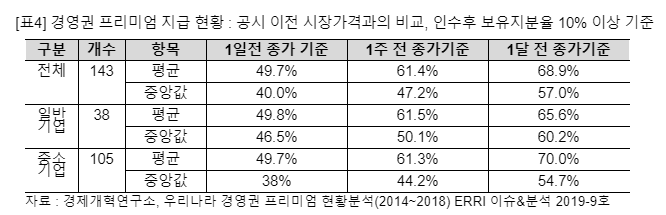 현재 최대주주 보유주식을 상속·증여하는 경우 중소기업 주식을 제외하고 20% 할증 평가를 하고 있으나, 경영권 프리미엄을 감안하면 이는 오히려 할인 혜택이라고 할 수 있습니다. 경제개혁연구소에서 발표한 ‘우리나라 경영권 프리미엄 현황 분석(2014-2018)’ 자료를 살펴보면 경영권 프리미엄은 해당 기업의 시장 가격 대비 49%~68%로 나타났습니다. 경영권 프리미엄이 40% 이상 존재하는 상황에서 최대주주 보유주식에 대해 20%로 평가하는 것을 할증이라 할 수 없습니다.