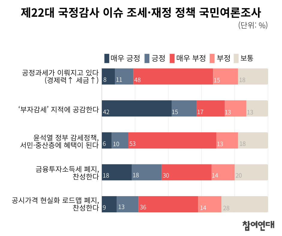 참여연대 조세재정개혁센터는 이번 국민여론조사 결과를 통해 윤석열 정부의 부자감세 등 조세·재정 정책에 대한 비판적인 여론이 증가하고 있는 것을 확인할 수 있었습니다. 22대 국회는 민심을 반영하여 국정감사에서 세수부족과 더불어 민생 회복 및 복지 확대를 위한 세원 확충 문제를 잘 지적할 필요가 있습니다. 또 다가오는 예산 심사 시기에는 윤석열 정부의 ‘무한감세’ 세법개정안을 막아내는 등 제 역할을 다하여야 할 것입니다. 참여연대 조세재정개혁센터는 앞으로도 매월 조세·재정 정책에 대한 시민의 의견을 확인하고, 이와 관련된 제도 개선 활동을 이어나갈 예정입니다.