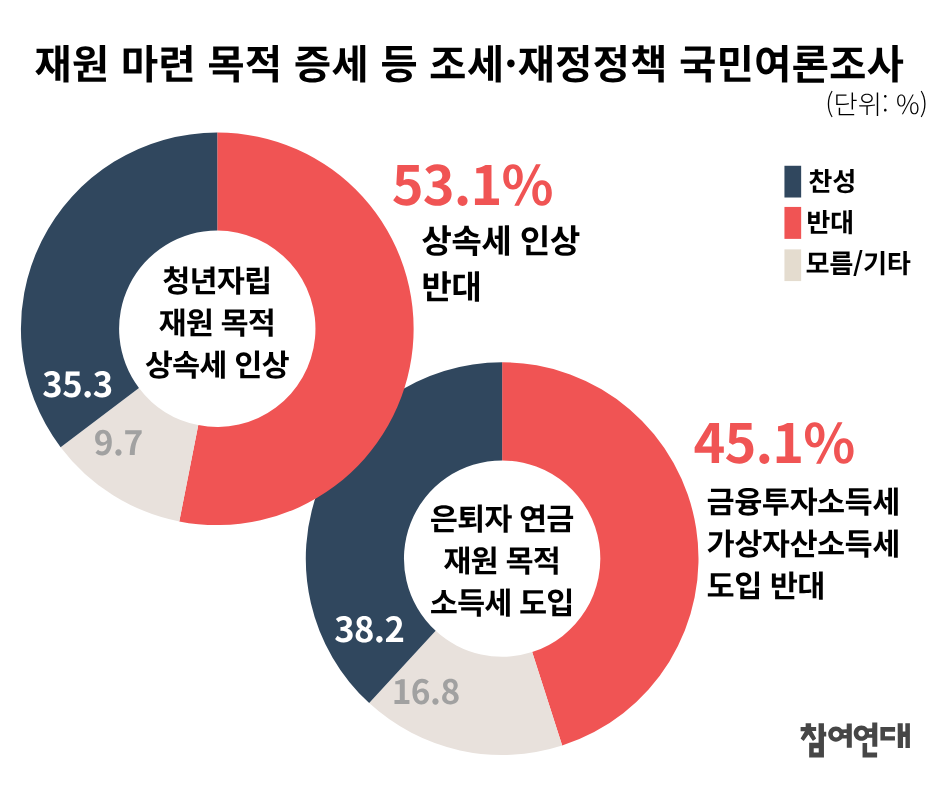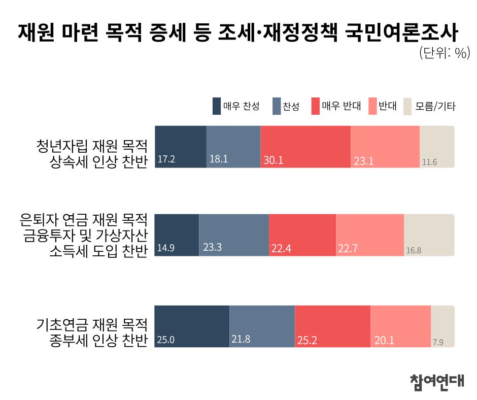 이에 참여연대는 세법·예산안 심사를 앞두고 목적세 도입 등 조세·재정정책 현안에 대한 시민들의 의견을 묻는 국민여론조사를 실시했습니다. 구체적인 문항으로는 △청년자립 재원 목적 상속세 인상, △은퇴자 연금 재원 목적 소득세 도입, △기초연금 재원 목적 종부세 인상에 대한 찬반 의견을 물었습니다.
