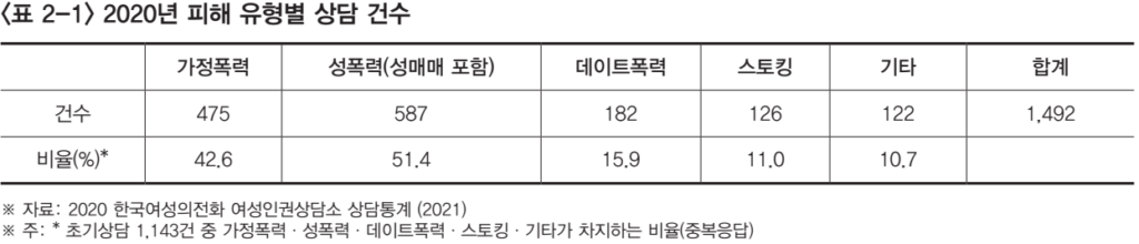 2020년 한 해 동안 한국여성의전화에서 진행한 초기상담 1,143건을 피해유형별로 중복으로 집계 하였을 때, 가정폭력을 주로 호소한 상담은 42.6%(475건)이었다. 눈에 띄는 점은 여성들이 겪는 폭력이 ‘가정폭력, 성폭력, 데이트폭력, 스토킹’ 등 하나의 유형으로 국한되지 않고 다층적ᆞ복합적으로 발생했다. 가정폭력에서 성폭력을 동반한 사례는 16%, 스토킹을 동반한 사례는 6.3%였다. 데이트폭력에서 성폭력이 있는 경우 53.3%, 스토킹이 함께 발생한 사례는 38.1%였다. 이처럼 교차적이고 중첩적으로 발생하는 여성 폭력을 ‘가정폭력, 성폭력, 데이트폭력, 스토킹’과 같이 분절적으로 구분하는 방식으론 여성폭력 현실을 파악하기에 한계가 있다.