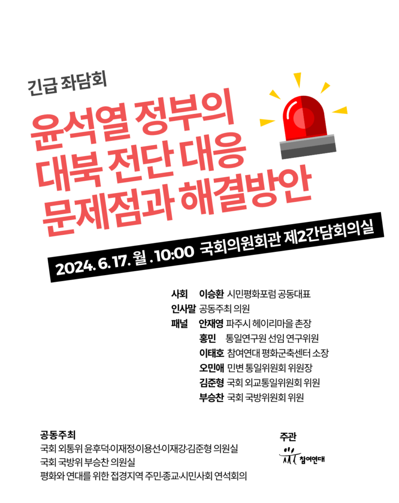 오늘(6/17) 국회의원회관 제2간담회실에서 <윤석열 정부의 대북 전단 대응 문제점과 해결방안> 긴급 좌담회가 개최되었습니다. 이번 좌담회는 국회 외교통일위원회 윤후덕·이재정·이용선·이재강·김준형 의원실, 국회 국방위원회 부승찬 의원실과 평화와 연대를 위한 접경지역 주민·종교·시민사회 연석회의가 공동주최하고 참여연대가 주관하였습니다.