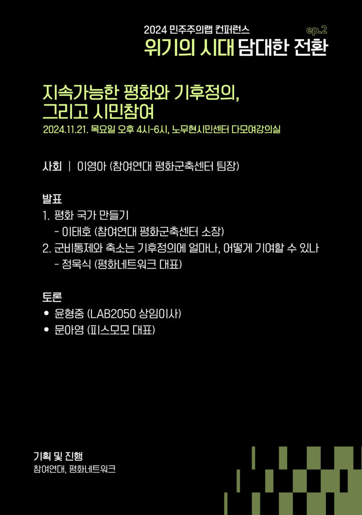 이에 참여연대와 평화네트워크는 지난 11월 21일(목) 2024 민주주의랩 컨퍼런스에서 <지속가능한 평화와 기후정의, 그리고 시민참여>를 진행합니다. 이 세션을 통해 전쟁 위기가 고조되는 상황에서 어떻게 평화국가를 만들 것인지, 군비통제/축소는 어떻게 기후정의에 기여하는지 살펴보고 논의하는 자리를 가졌습니다.