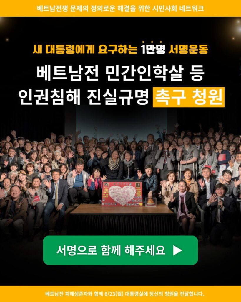 2025.6.20(금)에 시민 대표단과 베트남전 피해자가 함께 대통령실에 여러분의 청원을 제출할 예정입니다