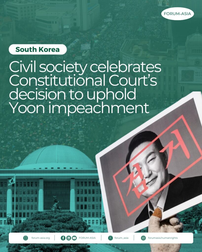The Asian Forum for Human Rights and Development (FORUM-ASIA) welcomes the decision of the South Korean Constitutional Court to uphold the impeachment of President Yoon Suk Yeol.