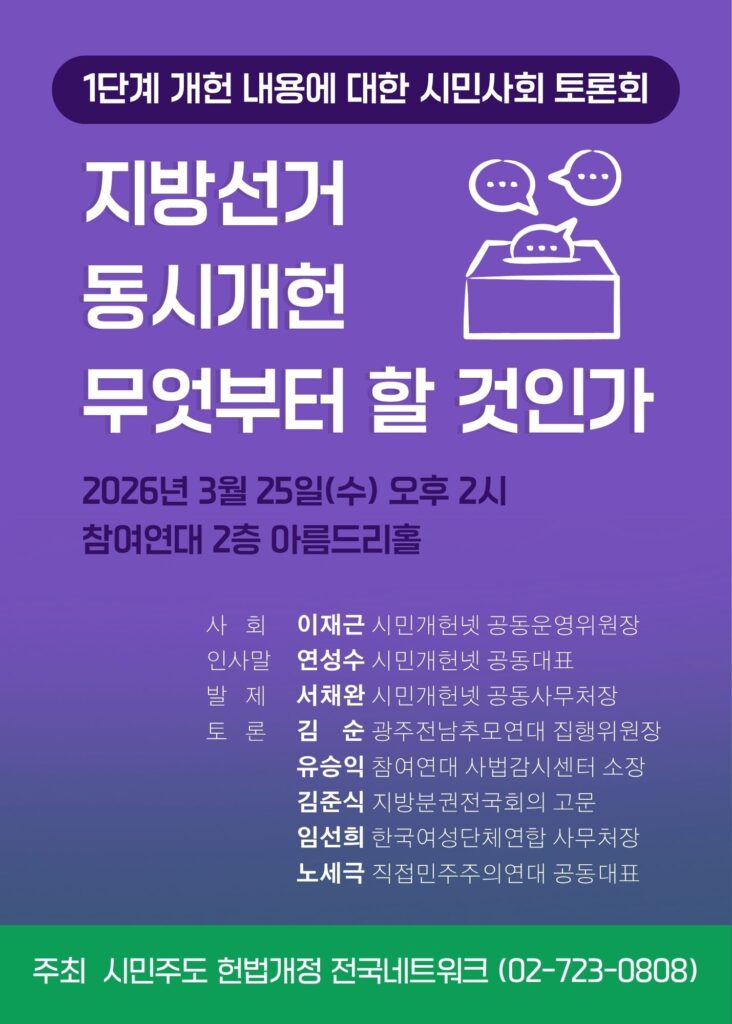 오늘(3/25) 오후 2시 시민주도 헌법개정 전국 네트워크(약칭 ‘시민개헌넷’)는 1단계 개헌에 어떤 내용들이 포함되어야 하는지 논의하는 시민사회 토론회 “지방선거 동시개헌 무엇부터 할 것인가”를 참여연대 2층 아름드리홀에서 개최했습니다.