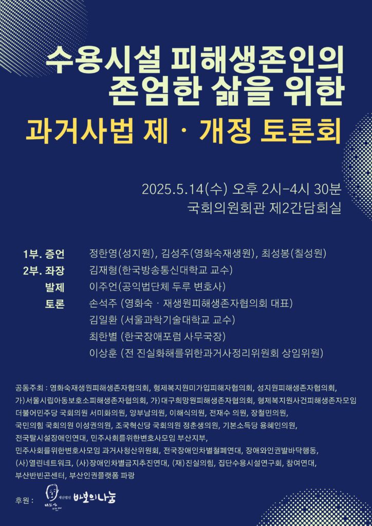 생존자협의회는 오는 2025년 5월 14일(수) 오후 2시, 국회의원회관 제2간담회실에서 중단없는 집단수용시설 진상규명과 피해생존인의 존엄한 삶을 위한 증언 및 「진실·화해를위한과거사정리기본법」 (이하 ‘과거사법’) 등 제·개정안 토론회를 직접 개최합니다. 본 증언 및 토론회는 오는 5월 26일 진실·화해를위한과거사정리위원회(이하 ‘진화위’)가 종료된 후, 피해생존인 중심의 3기 진화위 출범 방안을 모색하기 위해 각 집단수용시설 피해생존인이 연대하여 개최합니다.